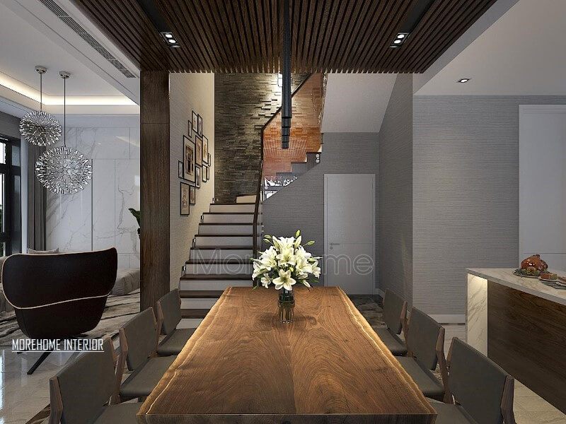 Mẫu bàn ghế ăn gỗ công nghiệp mang đến cho gia chủ một không gian dùng bữa lãng mạn mà không kém phần ấm áp