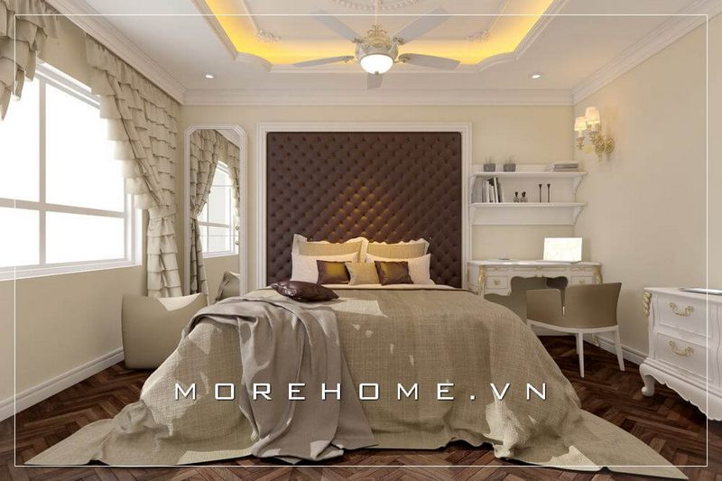 Thiết kế nội thất phòng ngủ chung cư cao cấp phong cách tân cổ điển, chiếc giường ngủ bọc da đầu giường cách điệu trở thành điểm nhấn ấn tượng cho cả không gian này