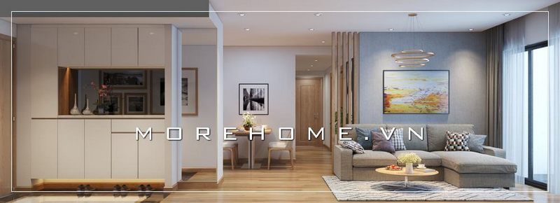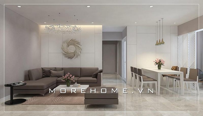 Phòng khách căn hộ thiết kế với bộ sofa nỉ chữ L màu xám được đặt ở không gian phòng khách rộng lớn là điểm nhấn ấn tượng tăng thêm sự sang trọng cho không gian