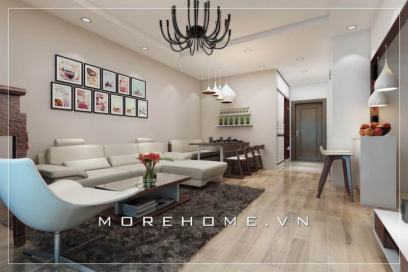 Phòng khách căn hộ chung cư gần gũi mà năng động thoáng đãng với mẫu sofa văng ba tiện lợi kiểu dáng hiện đại trẻ trung hài hòa cùng sắc trắng tinh tế.