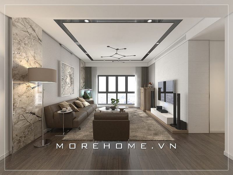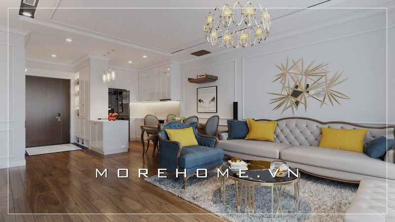 Sự kết hợp độc đáo của mẫu sofa tân cổ điển vỏ bọc da cao cấp được thiết kế theo kiểu văng đơn giản với ghế sofa đơn bọc nhung ấm áp và tone xanh tươi mới là trung tâm ấn tượng của phòng khách chung cư