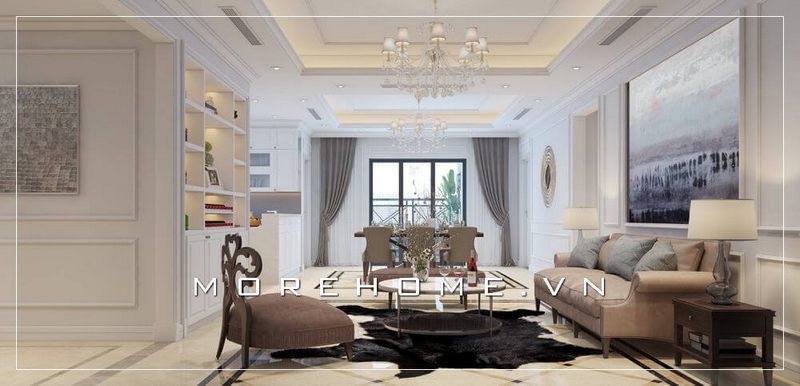Mẫu sofa phòng khách với đường cong tân cổ điển ấn tượng với sự kết hợp giữa tông màu nâu với màu trắng chủ đạo tạo không gian nổi bật cho căn phòng