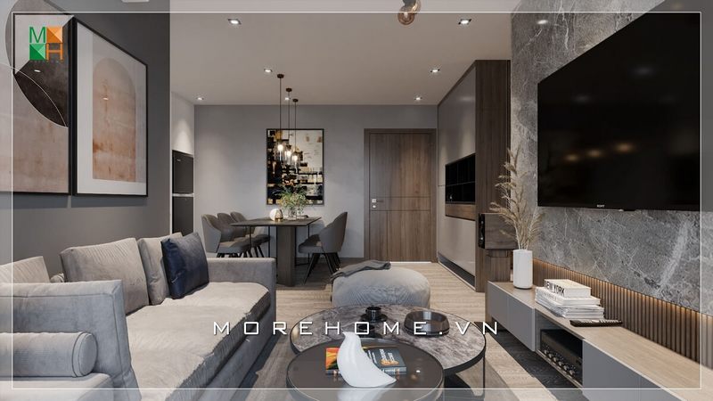 Không thể cưỡng lại vẻ đẹp thu hút đầy quyến rũ của chất liệu vỏ bọc sofa nhung màu xám trầm lắng, êm ái mà thoáng đãng với kiểu dáng văng hiện đại giữa phòng khách căn hộ chung cư.
