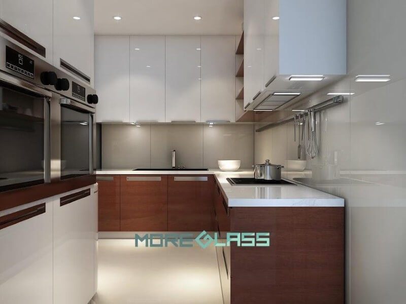 Thiết kế và thi công mẫu kính ốp bếp màu ghi xám kết hợp với tủ bếp cùng tông màu tạo nên không gian nhà bếp sang trọng