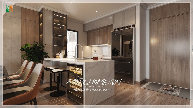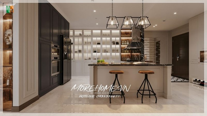 Thiết kế nội thất phòng bếp riêng biệt với không gian khác vẫn đảm bảo tính sang trọng và tiện nghi của không gian