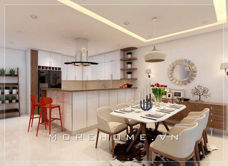 Kệ tủ đựng đồ hiện đại cùng tone màu trắng tạo sự đồng nhất cho cả không gian riêng tư thoải mái không bị rối mắt