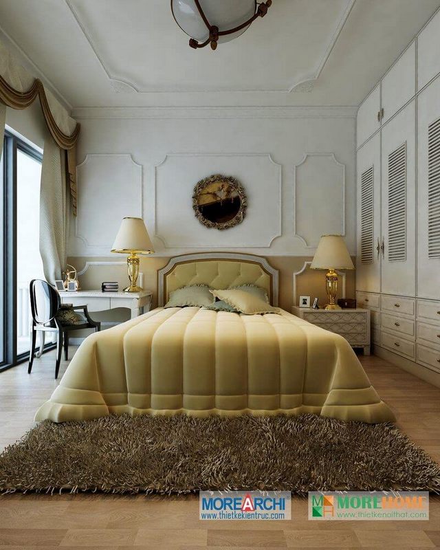 Tủ quần áo gỗ tự nhiên phun sơn trắng cao cấp, phần tay nắm mạ vàng tân cổ điển tô điểm cho căn phòng thêm cuốn hút và ấn tượng hơn