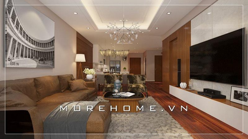 Bố trí phòng khách chung cư liền bếp tạo sự liền mạch với đồ nội thất gỗ óc chó kết hợp cùng gỗ sơn trắng tạo vẻ đẹp hiện đại độc đáo cho phòng khách chung cư