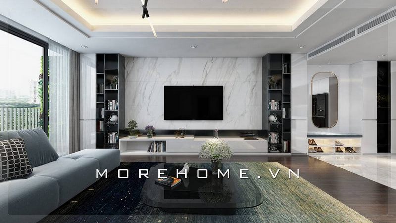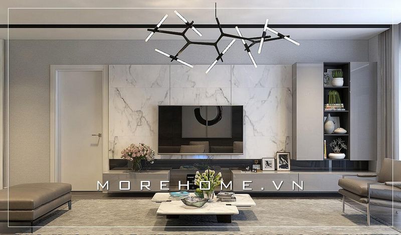 Mẫu thiết kế phòng khách chung cư cao cấp với kệ ti vi treo tường cùng bức tường ốp đá vân mây màu trắng sang trọng tạo điểm nhấn nổi bật cho không gian căn nhà