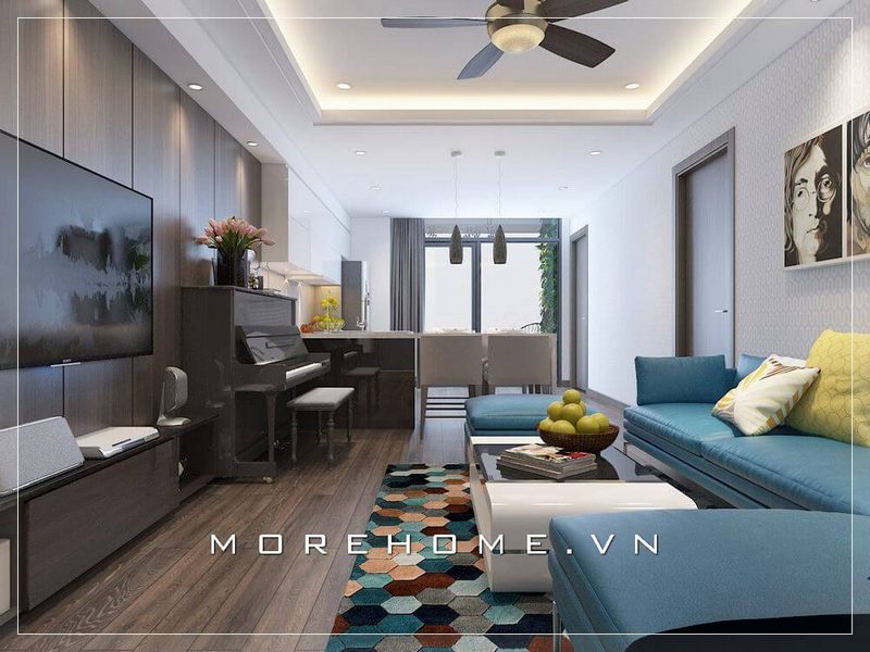 Phối màu khéo léo giữa sắc xanh trắng kết hợp nâu trầm từ gỗ óc chó ốp tường đã tạo nên vẻ đẹp hài hòa, sang trọng cho phòng khách liền bếp căn hộ chung cư.