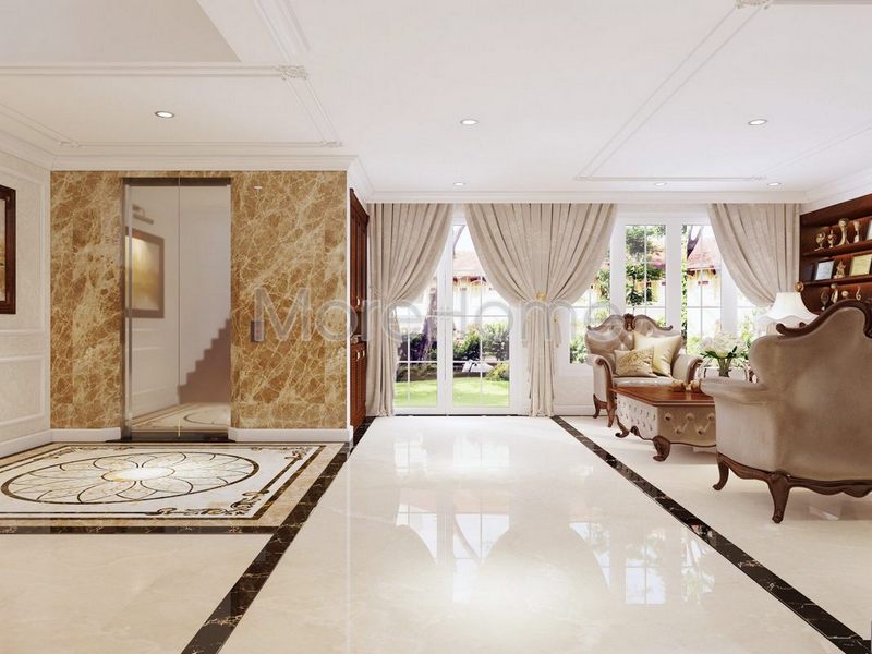Dù với chất liệu đá tự nhiên cứng rắn nhưng với đôi tay khéo léo của các nghệ nhân Morestone, mẫu đá trang trí lát sàn nơi sảnh chờ đẹp ấn tượng với những họa tiết tỉ mỉ, đối xứng.