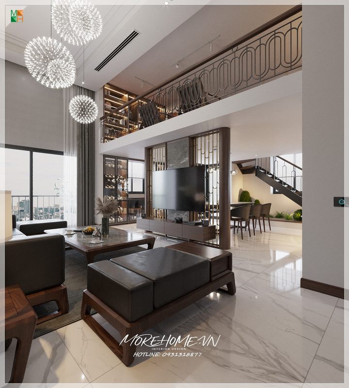 Thiết kế không gian phòng khách thông tầng với đầy đủ những nội thất tiện nghi mang đến 1 chất lượng cuộc sống hoàn mỹ cho mọi thành viên trong gia đình.